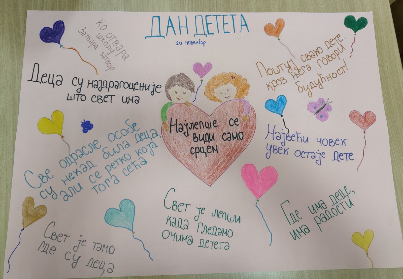 Такође, заједничком сарадњом неколико ученика из осмог и трећег разреда са педагогом је радило на изради плаката. Та комбинација млађих и старијих ученика доноси осећај заједништва, сарадње, слоге, креативности. Плакат је пун порука о важности детињства, љубави према њима и поштовању. Порукама као што су “Деца су најдрагоценије што свет има”, “Поштуј свако дете, кроз њега говори будућност”, “Свет је лепши када гледамо очима детета”, показујемо колико је важно неговати дечији свет, њихову искреност, гледати свет њиховим очима и бринути о њима. Јер, на деци и младима свет остаје.