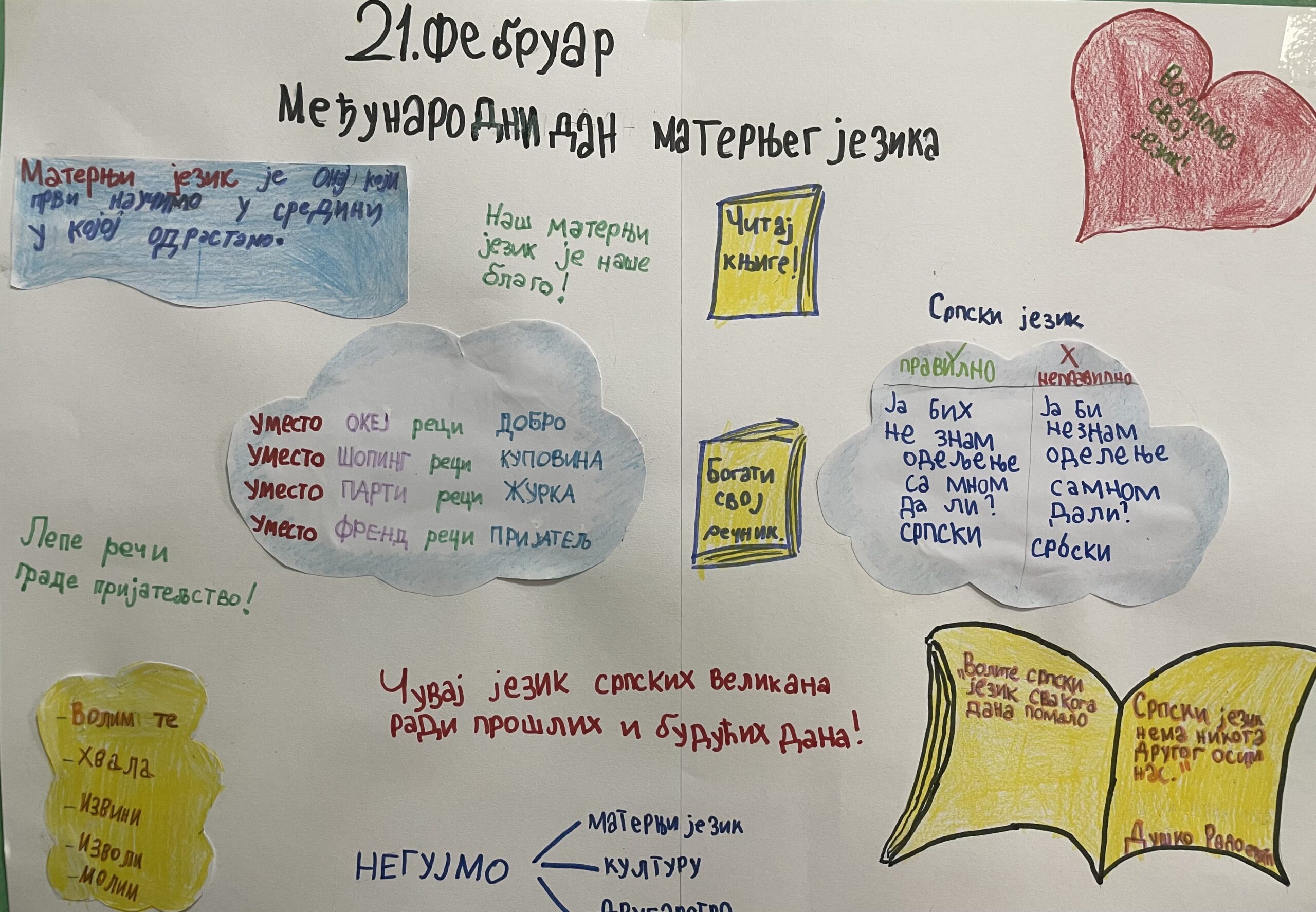 Кроз разговор и заједничке активности сазнали су шта је матерњи језик, зашто је важан за наш идентитет и културу, као и на које начине можемо да га негујемо и чувамо. Посебно смо истакли значај правилног говора, лепог изражавања, читања књига и поштовања језичке разноликости.